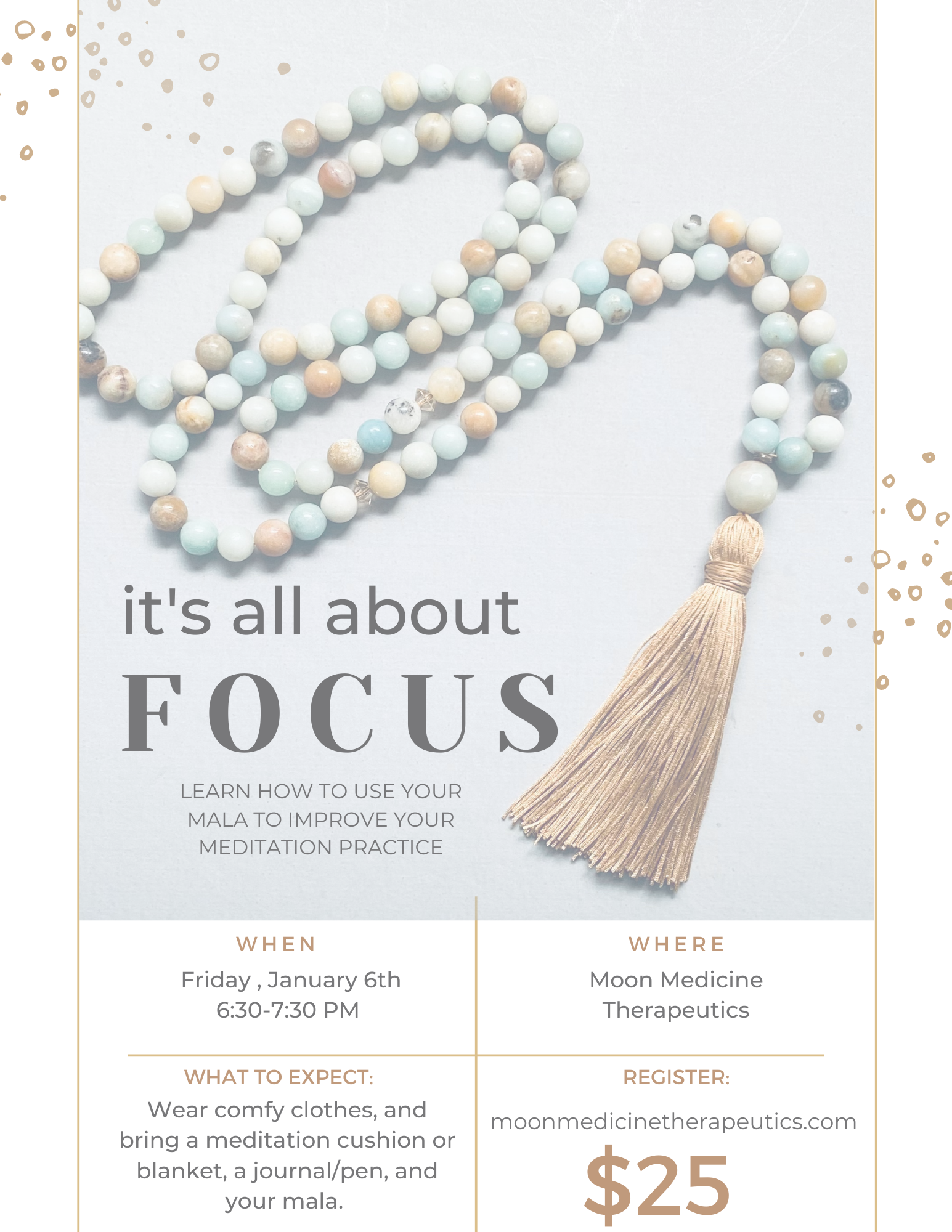 Wear comfy clothes and bring a meditation cushion or blanket, a journal/pen, and your mala.